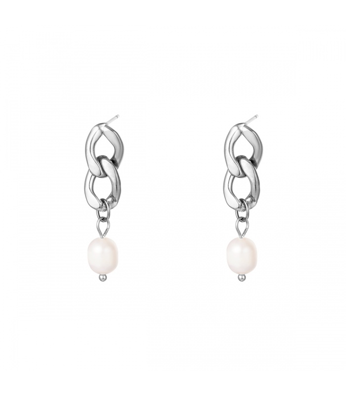 Zilverkleurige ketting oorbellen met zoetwaterparel.