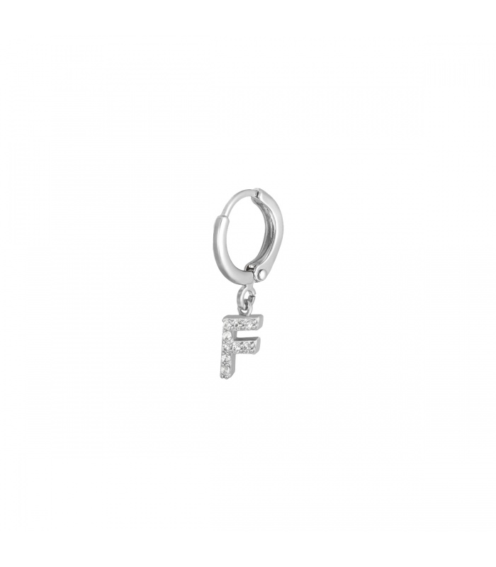 Zilverkleurige oorbel met zirkonia steentjes en initiaal F