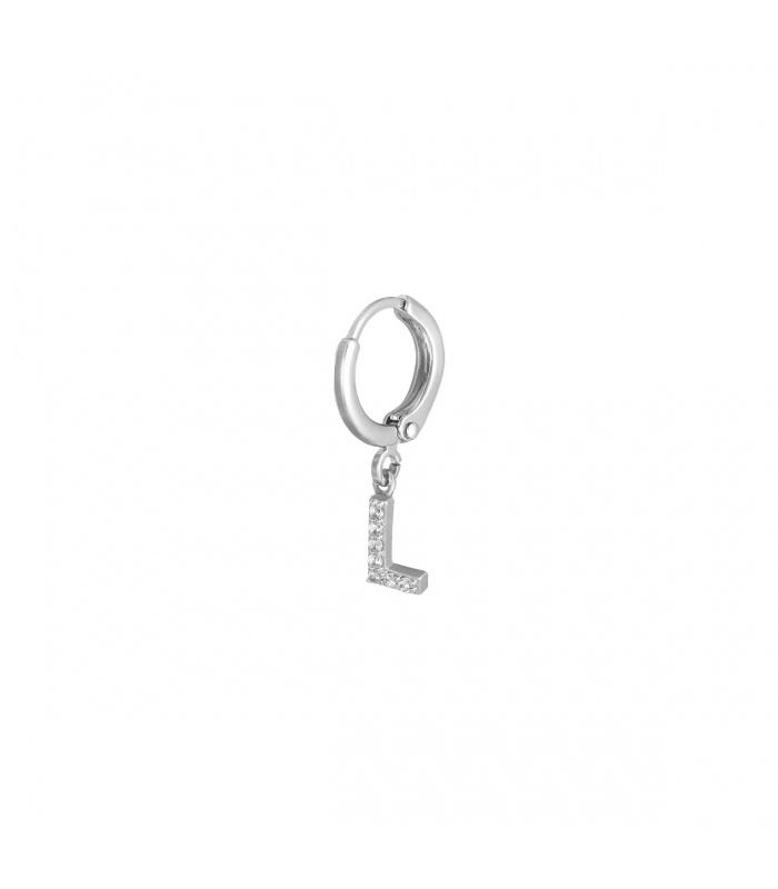 Zilverkleurige oorbel met zirkonia steentjes en initiaal L.