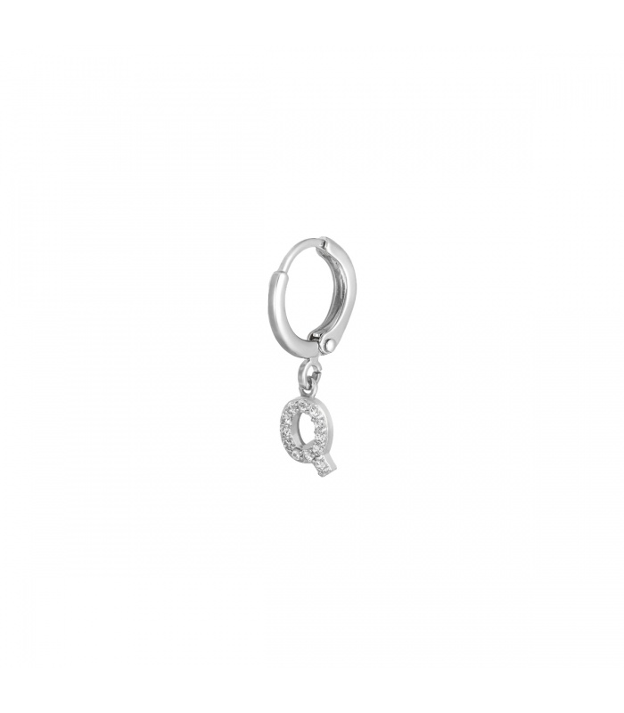 Zilverkleurige oorbel met zirkonia steentjes en initiaal Q