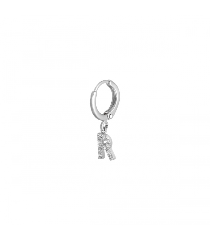 Zilverkleurige oorbel met zirkonia steentjes en initiaal R.