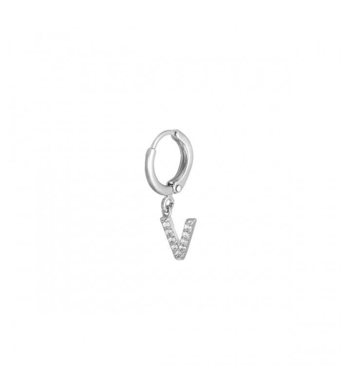Zilverkleurige oorbel met zirkonia steentjes en initiaal V.