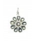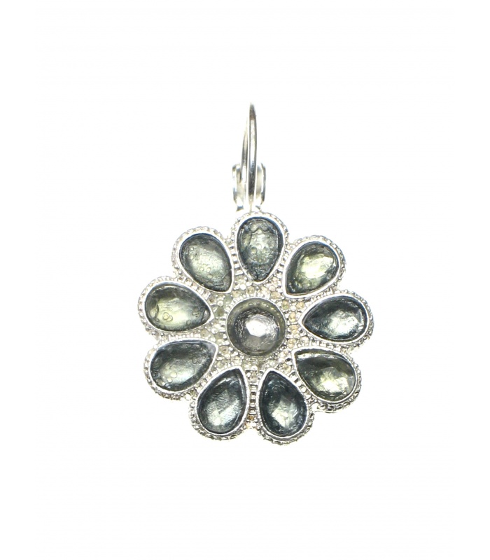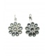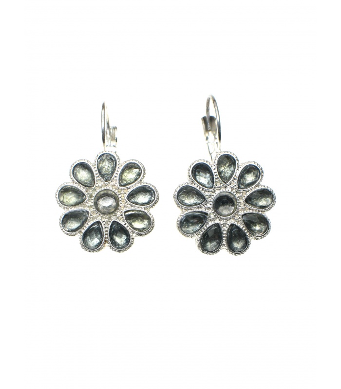 Zilverkleurige oorbellen in de vorm van een bloem met grijze steentjes
