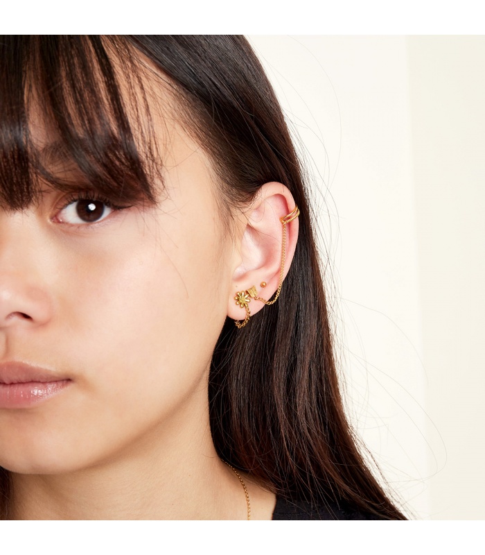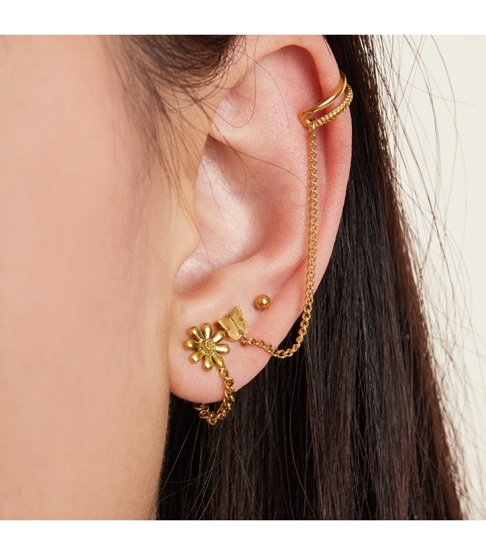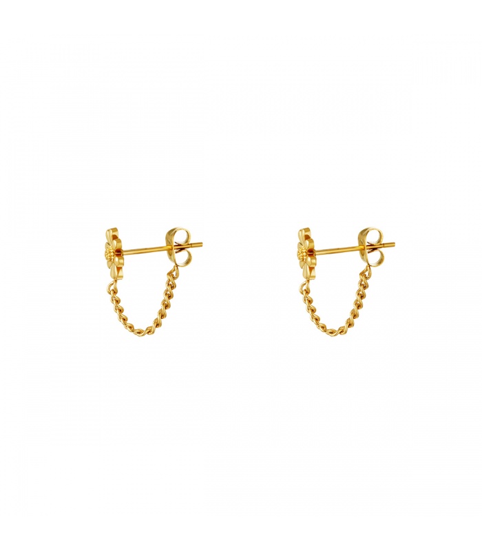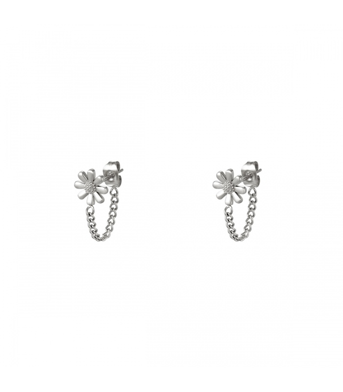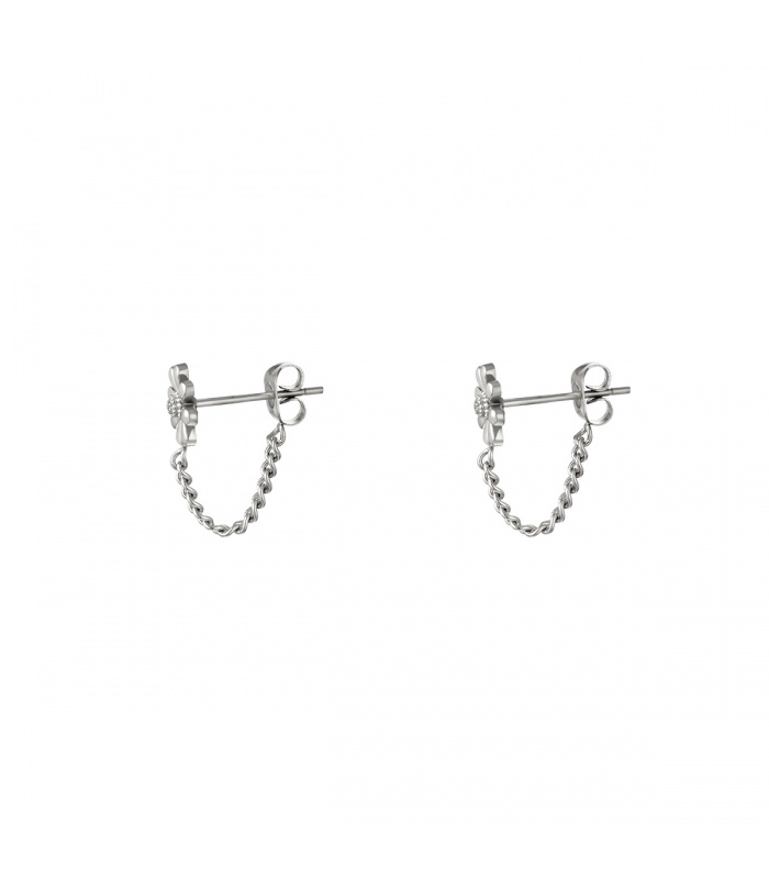 Zilverkleurige oorbellen met bloem en een klein kettingkje die aan de steker verbonden is.