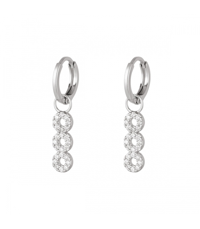 Zilverkleurige oorbellen met drie rondjes van steentjes.
