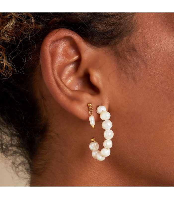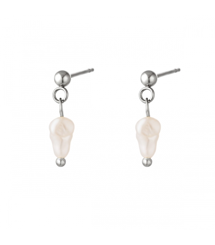 Zilverkleurige oorbellen met hangende zoetwaterparel.