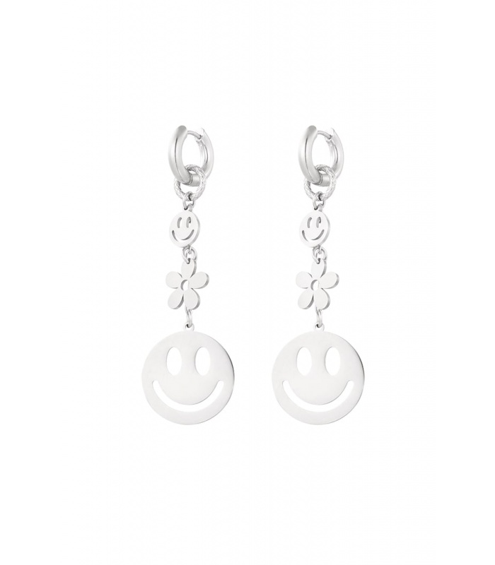 Deze zilverkleurige oorbellen combineren speelsheid met elegantie. De hangers bestaan uit een vrolijke smiley en een delicate bloem. Perfect om elke outfit op te fleuren en een glimlach op je gezicht te toveren. Deze oorbellen zijn ideaal voor wie op zoek is naar een accessoire dat zowel stijlvol als speels is. Ze voegen een unieke touch toe aan je look en zijn geschikt voor zowel casual als formele gelegenheden.