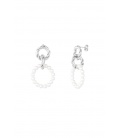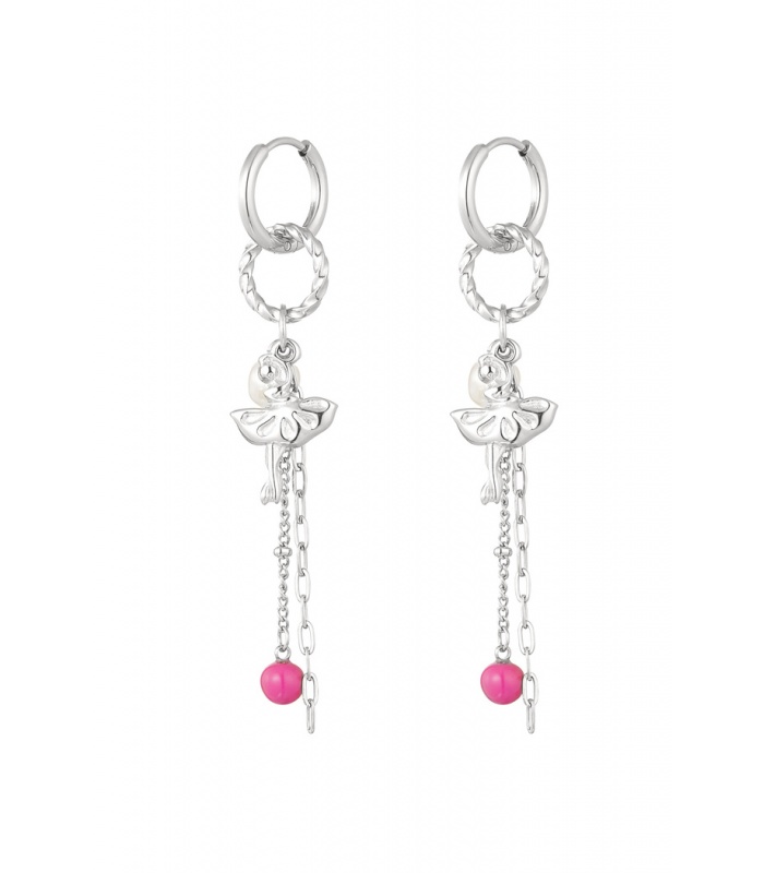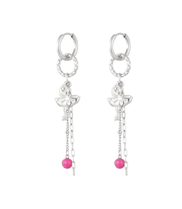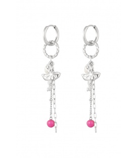 Zilverkleurige oorhangers met bedels en een roze kraaltje