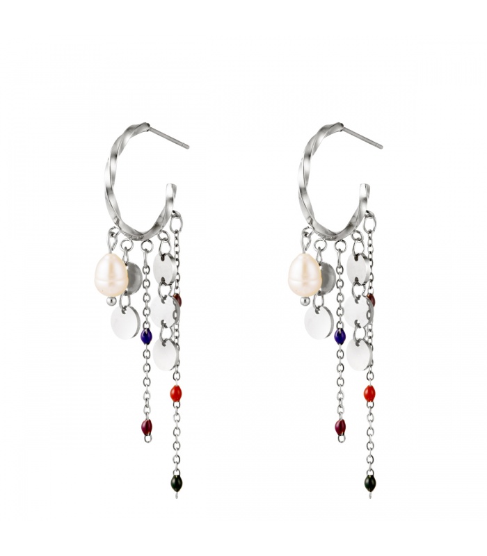 Zilverkleurige oorhangers met bungelende cirkels, parels en kleurtjes