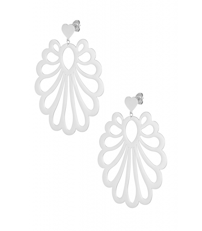 Zilverkleurige oorhangers met een feestelijk patroon en een hartje als oor stukje.