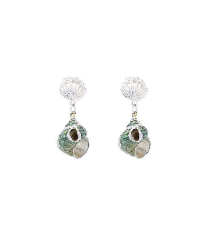 Zilverkleurige oorhangers met een groene schelpen hanger als een slakkenhuis.