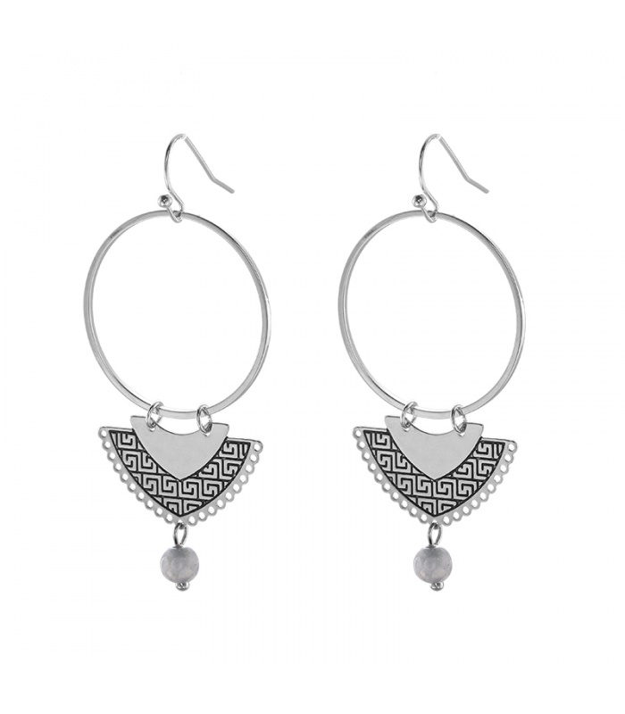 Zilverkleurige oorhangers met een mooi motief en een grijs kraaltje