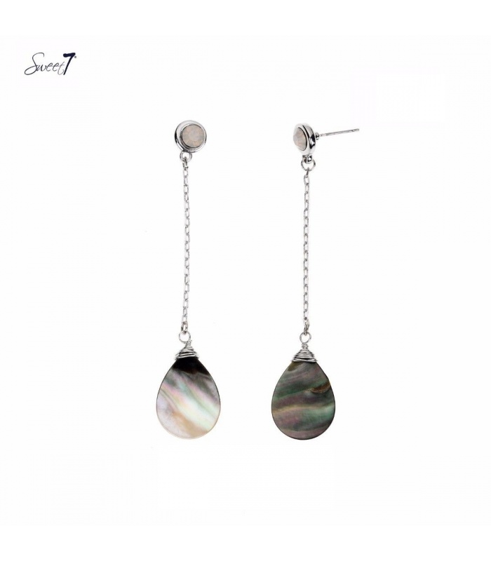Zilverkleurige oorhangers met een parelmoer plaatje aan een kettingkje .
