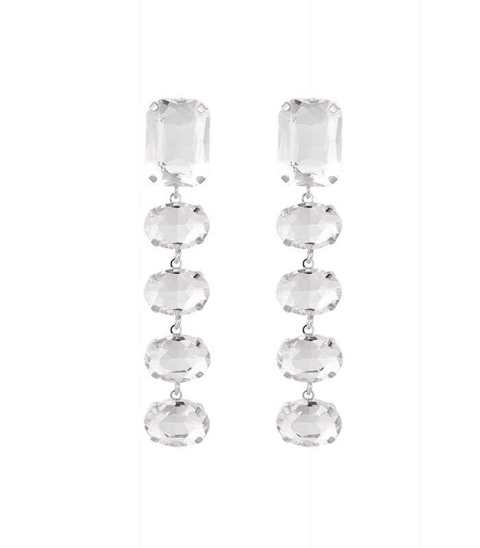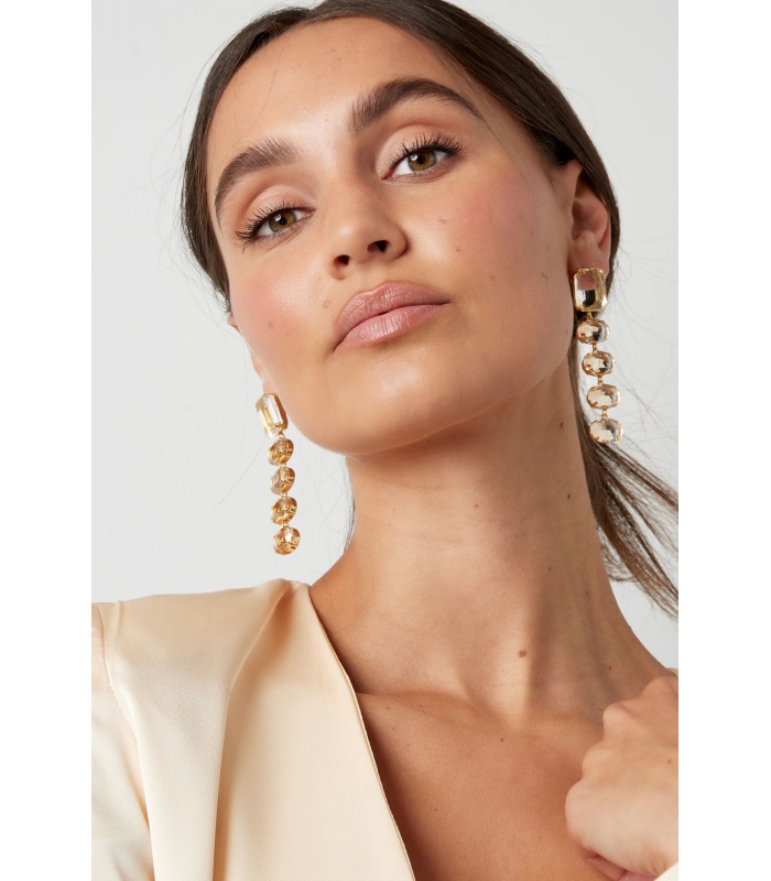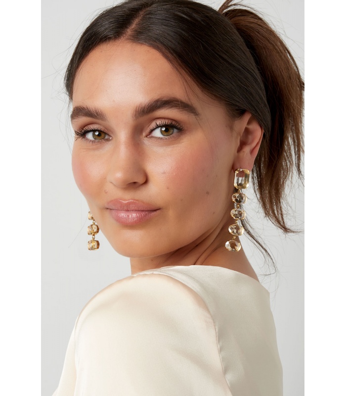 Deze prachtige oorhangers zijn versierd met heldere glas kralen, die een schitterend lichtspel creëren bij elke beweging.
