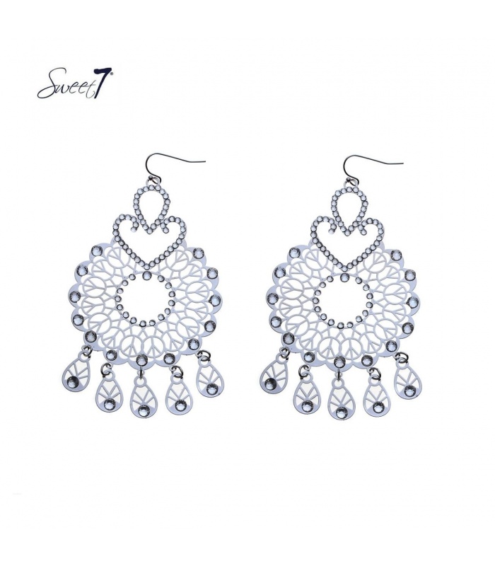 Zilverkleurige oorhangers met heldere steentjes.