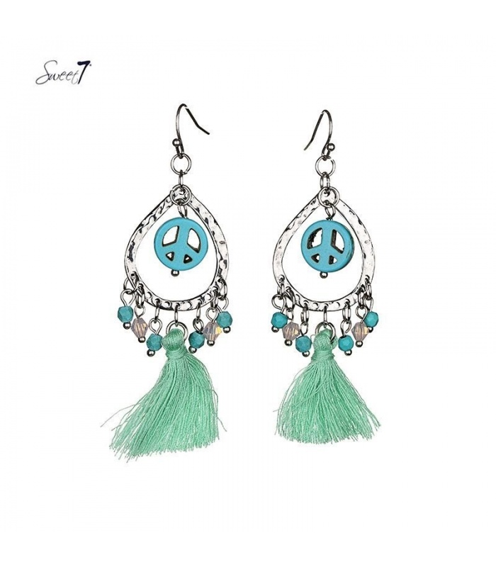 Deze zilverkleurige oorhangers van Sweet7 zijn voorzien van een peace bedel, kraaltjes en mint groene kwasten. Het resultaat is een vrolijke en speelse oorbel die perfect past bij een bohemian of festival outfit. De oorhangers zijn licht van gewicht en gemakkelijk te dragen. Combineer deze oorbellen met een maxi-jurk en sandalen voor een zomerse look, of draag ze bij een denim jack en shorts voor een festival vibe. Met deze oorhangers maak je elke outfit compleet.