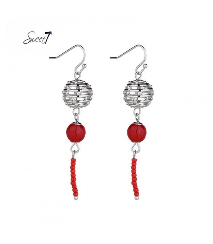 Zilverkleurige oorhangers met rode kraaltjes.