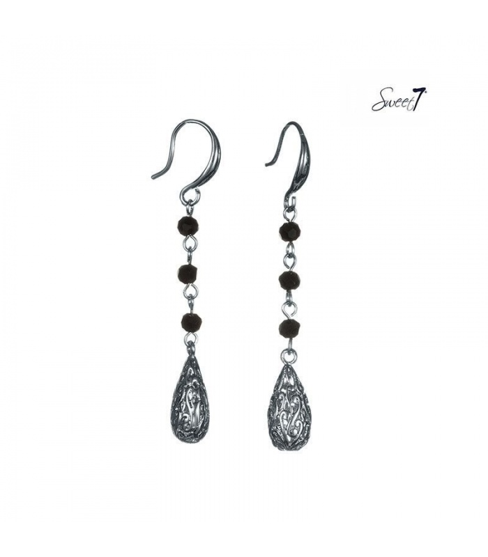 Zilverkleurige oorhangers met zwarte kleine kraaltjes.
