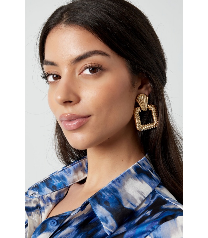 Hoe kan ik deze zilverkleurige vierkante oorhangers met print het beste stylen?