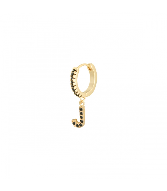 Goudkleurige oorbel met zwarte steentjes en hanger met de letter J.