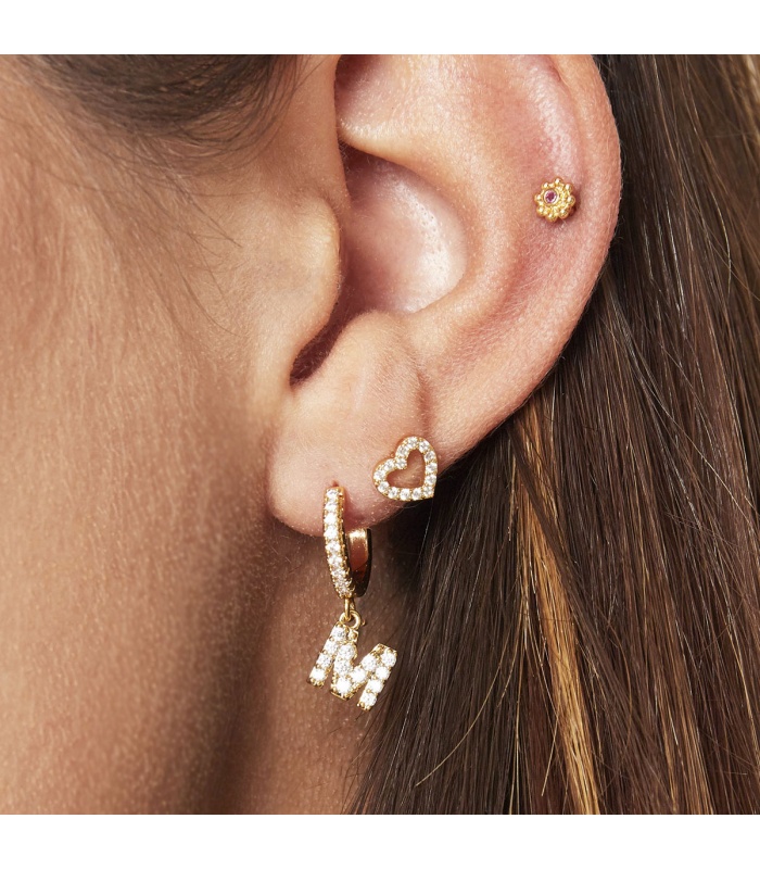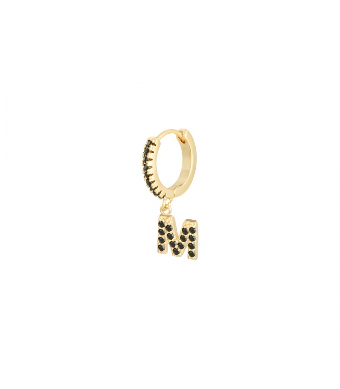 Goudkleurige oorbel met zwarte steentjes en hanger met de letter M