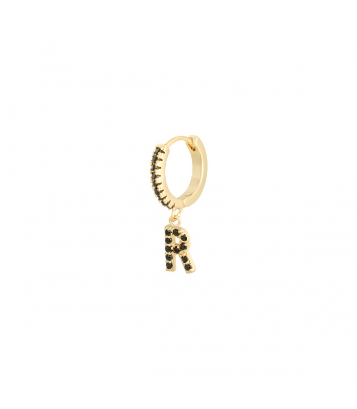Goudkleurige oorbel met zwarte steentjes en hanger met de letter R