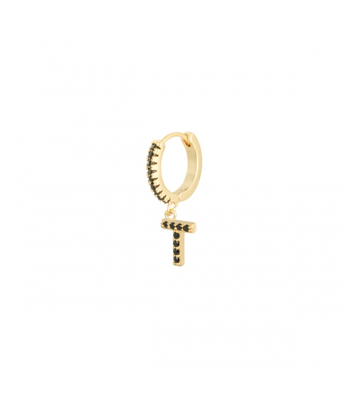 Goudkleurige oorbel met zwarte steentjes en hanger met de letter T