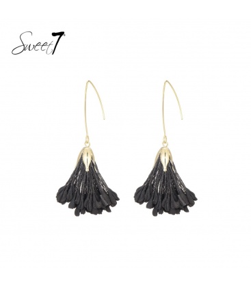 Voeg een vleugje luxe toe aan je look met deze goudkleurige oorhangers. De elegante oorbellen zijn versierd met zwart hangende raffia, wat zorgt voor een chique en opvallende uitstraling. Het verfijnde ontwerp maakt ze ideaal voor zowel casual als formele stijlen.