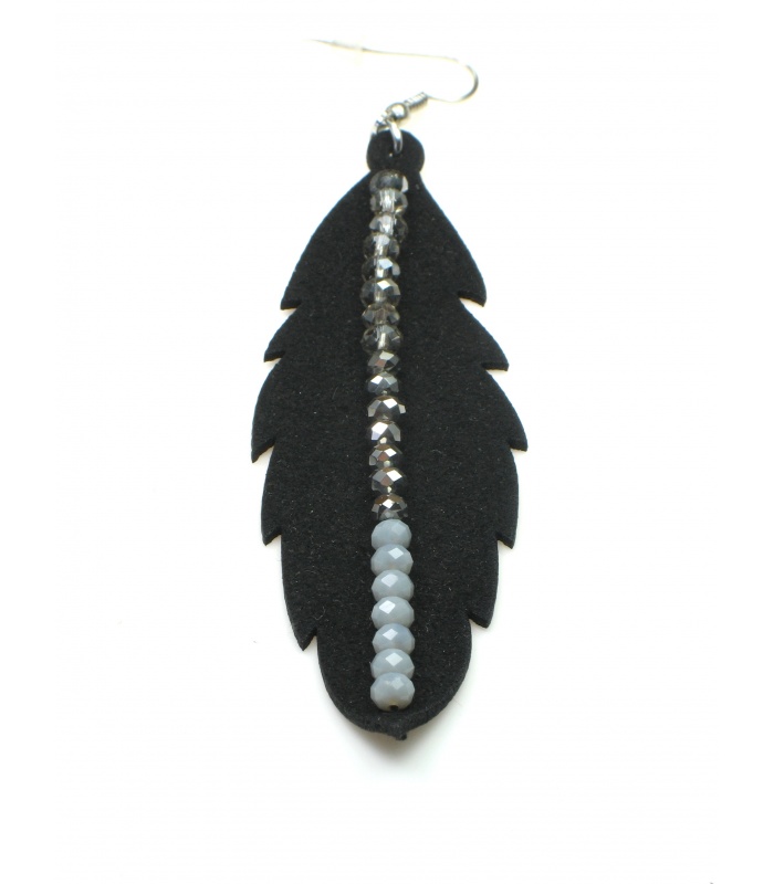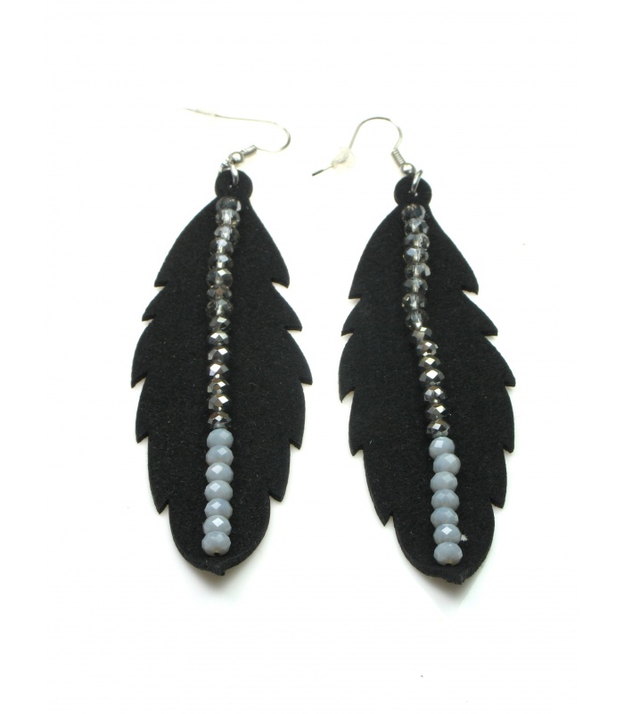 Lange zwarte oorbellen in de vorm van een blad met kralen nerf