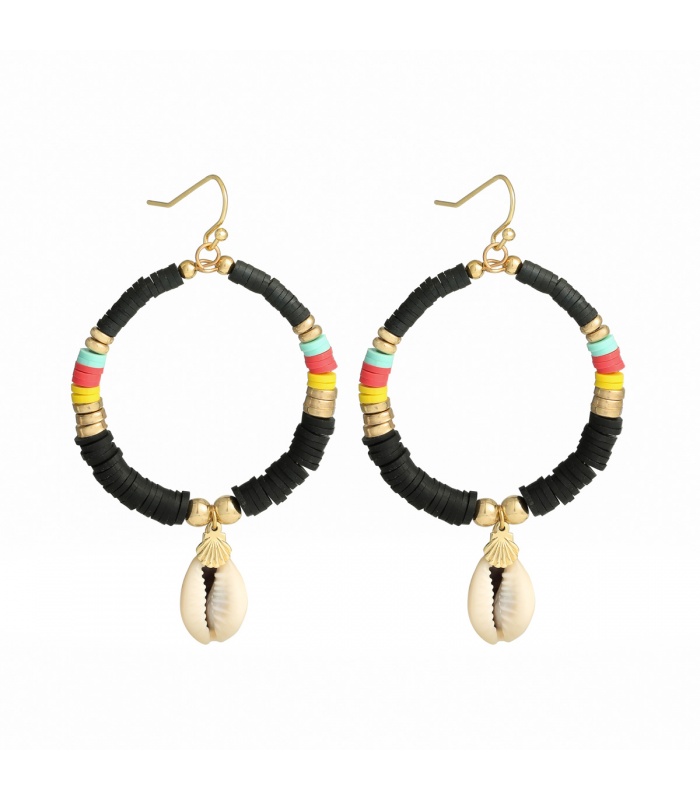 Oorbellen gemaakt van kleine zwarte ringetjes en schelpen bedel