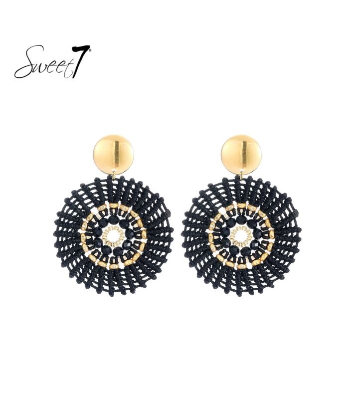 Hoe maak je moeiteloos indruk met een modern accessoire? Deze oorbellen combineren zwart textiel met goudkleurige accenten in een opvallend rond patroon. Het contrast tussen de materialen geeft elke look een eigentijdse twist, perfect voor zowel dag als avond.