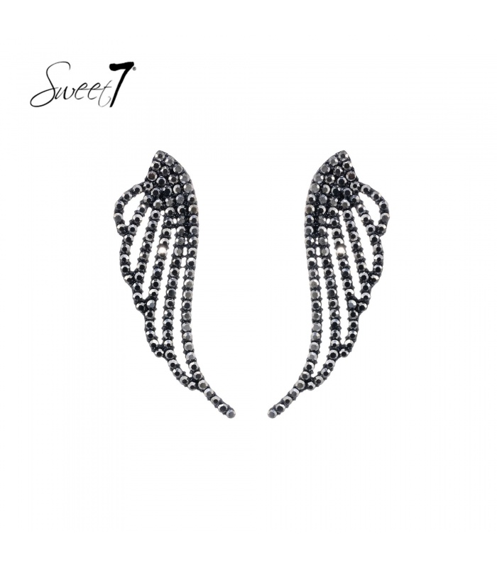 Hoe geef je je look een elegante twist? Deze oorbellen in vleugelvorm zijn bezet met glinsterende zwarte steentjes die subtiel het licht vangen. De vorm volgt sierlijk de lijn van het oor en zorgt voor een opvallend silhouet met moderne uitstraling.