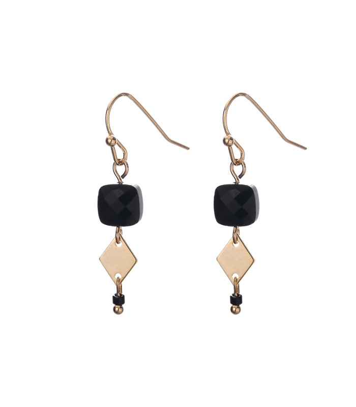 Trendy minimalistische zwarte gold plated oorhangers met een ruitvormige bedel.