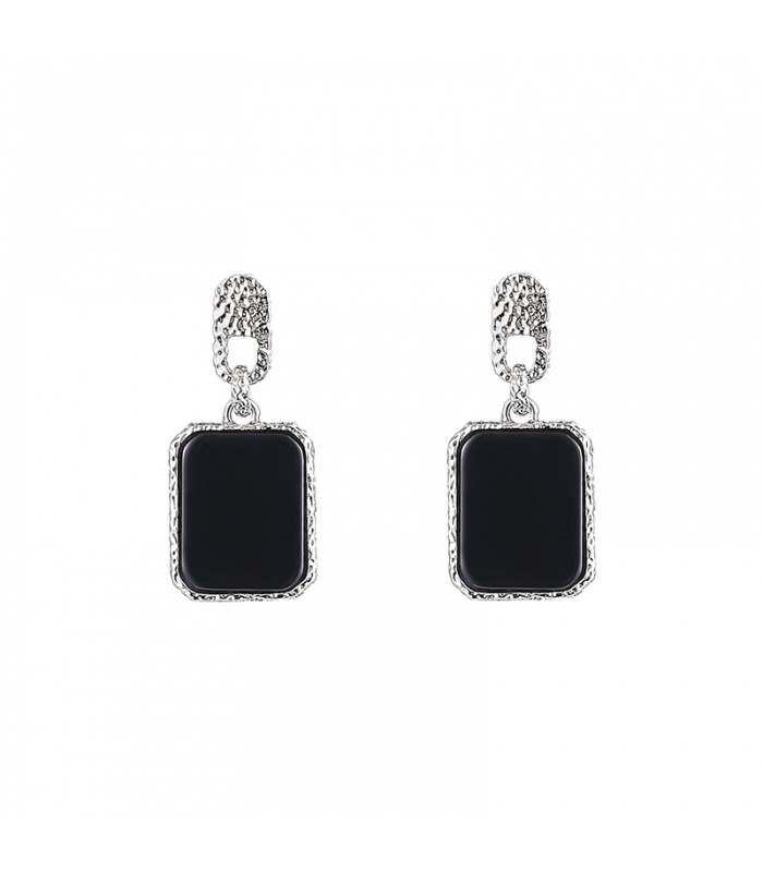 Zilverkleurige oorhangers met een zwarte steen en slotjes als oorstukje.