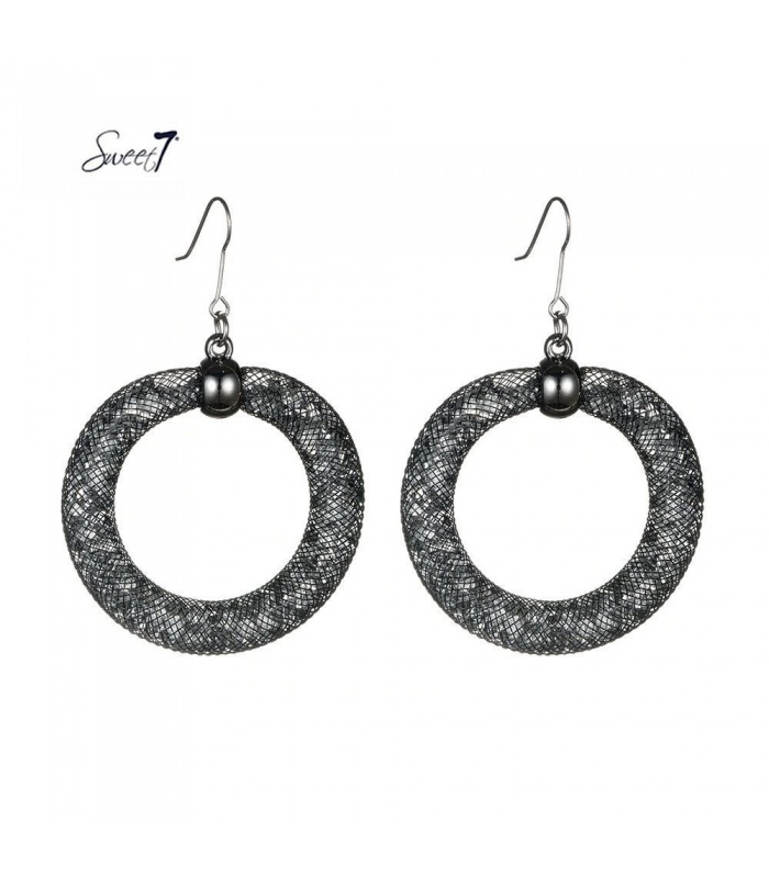 Oorbellen gemaakt van een nylon mesh gevuld met kleine grijze kunststof glitter steentjes.