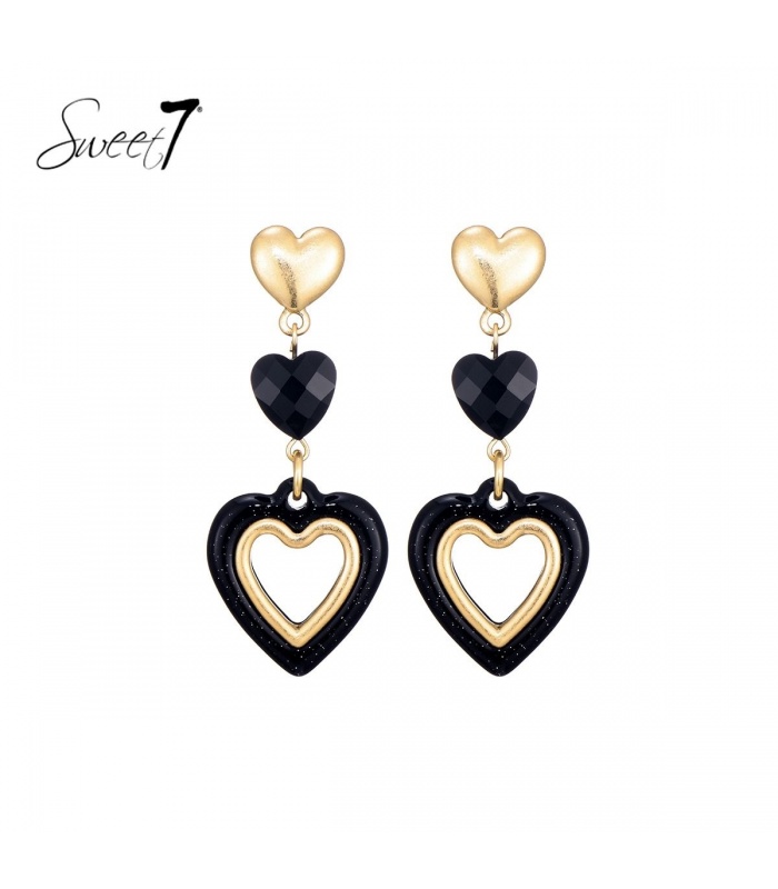 Het gouden hartje bovenaan zorgt voor een warme glans, terwijl de glanzende zwarte hartjes een mysterieuze touch toevoegen. De opengewerkte vorm maakt de oorbel licht en opvallend tegelijk. Een stijlvolle toevoeging aan je sieradencollectie.