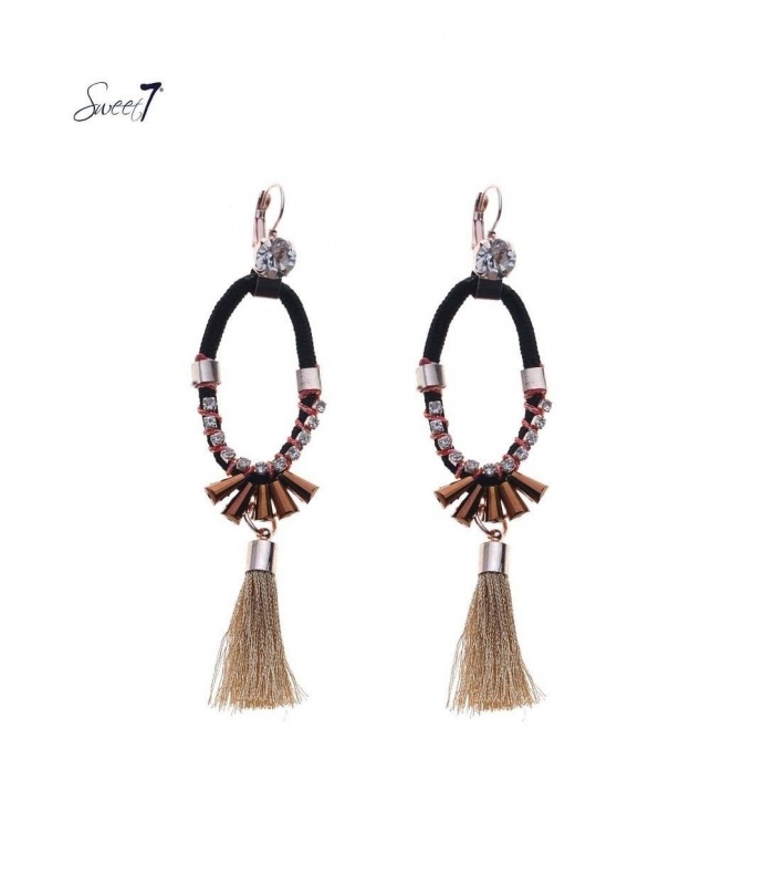 Zwarte oorhangers met goudkleurige kwasten en heldere strass steentjes en roze koord.