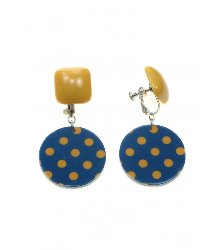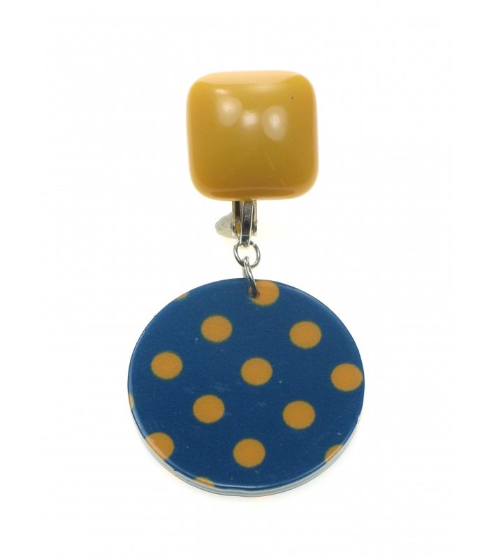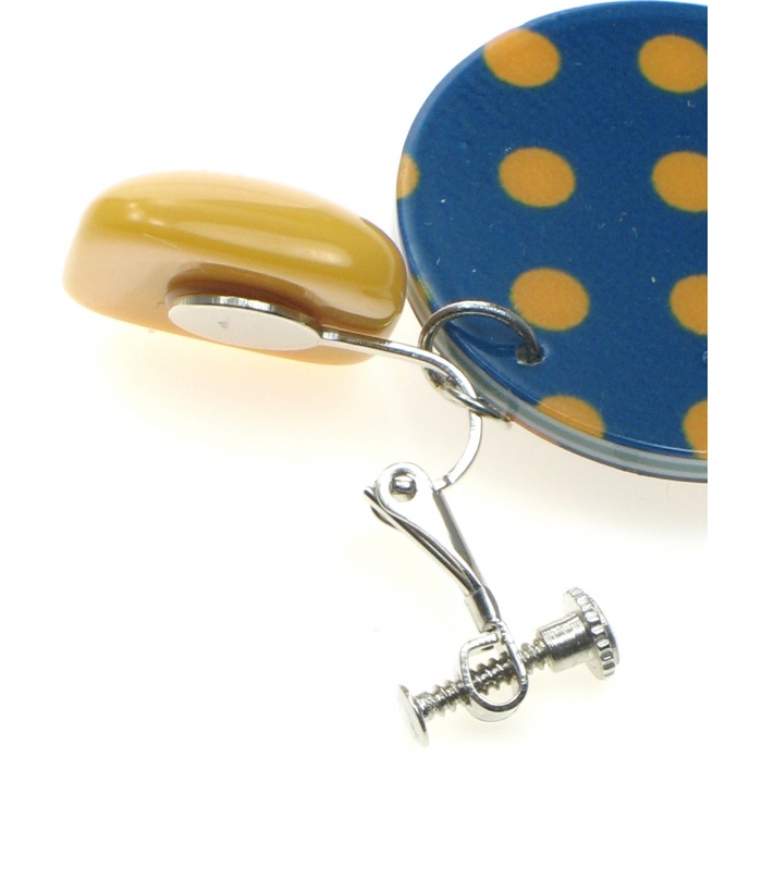 Bestel deze blauwe oorclips met gele stippen en oorstukje vandaag nog en voeg een vleugje kleur en stijl toe aan uw sieradencollectie!