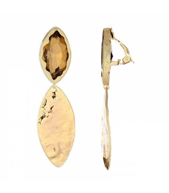 Zoek je stijlvolle oorclips die direct in het oog springen? Deze goudkleurige oorbellen combineren een facetgeslepen bruine steen met een organisch gevormd, gehamerd blad voor een krachtige look. De perfecte mix van glans en textuur geeft deze oorclips een eigentijdse, elegante uitstraling die moeiteloos past bij zowel een minimalistische outfit als een avondjurk.
