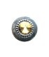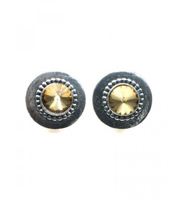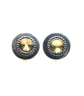 Oorclips met zilverkleurige rand met bruin oranje strassteen. De achterzijde van de clipoorbel is zilverkleurig. De diameter van de oorbel is 2 cm.