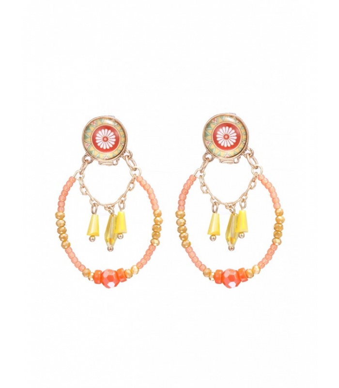 Geel met oranje oorclips met gele kraaltjes en een wit bloemetje in het oorstukje.