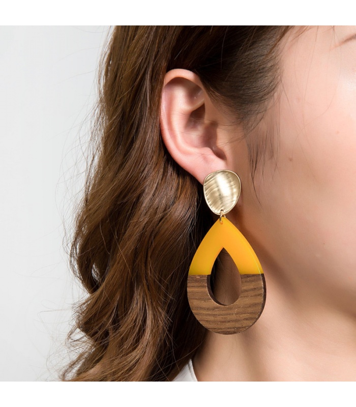 Oorclips met hout en gele hars. Sierlijke en opvallende oorbellen. Deze oorclips combineren natuurlijke warmtinten met vrolijke kleuraccenten. Fashion-geïnspireerd en perfect voor trendgevoelige looks. Ideaal voor mensen zonder gaatjes dankzij veilige klem die altijd nikkelvrij is.