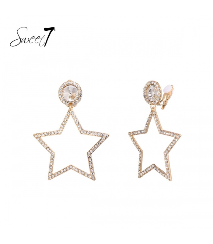 Ontdek onze prachtige goudkleurige oorclips in de vorm van een stralende ster, verfraaid met glinsterende stras steentjes. Deze exclusieve sieraden zijn een must-have voor elke modebewuste vrouw. Met hun elegante ontwerp en hoogwaardige afwerking zijn ze perfect voor elke gelegenheid.