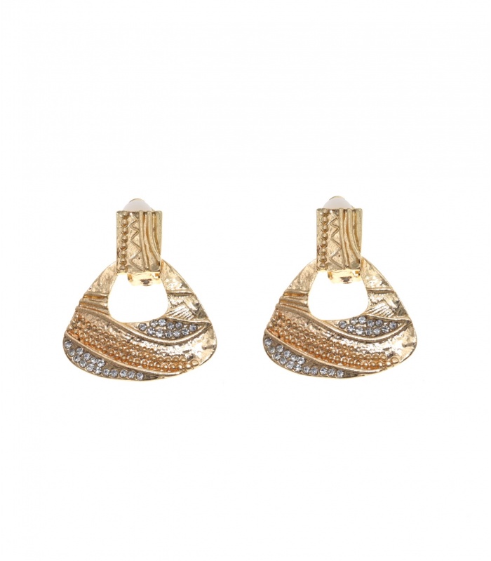 Goudkleurige oorclips met een bewerkt motief en strass steentjes