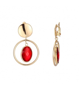 Goudkleurige oorclips met een rode steen in het midden van de hanger