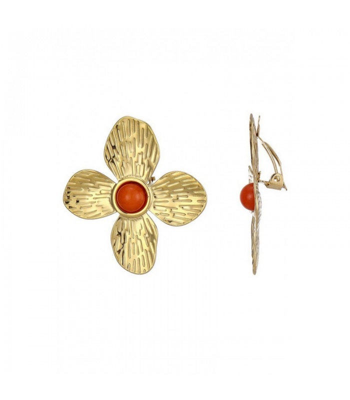 Oorclips goudkleurig in bloem vorm met een oranje hart