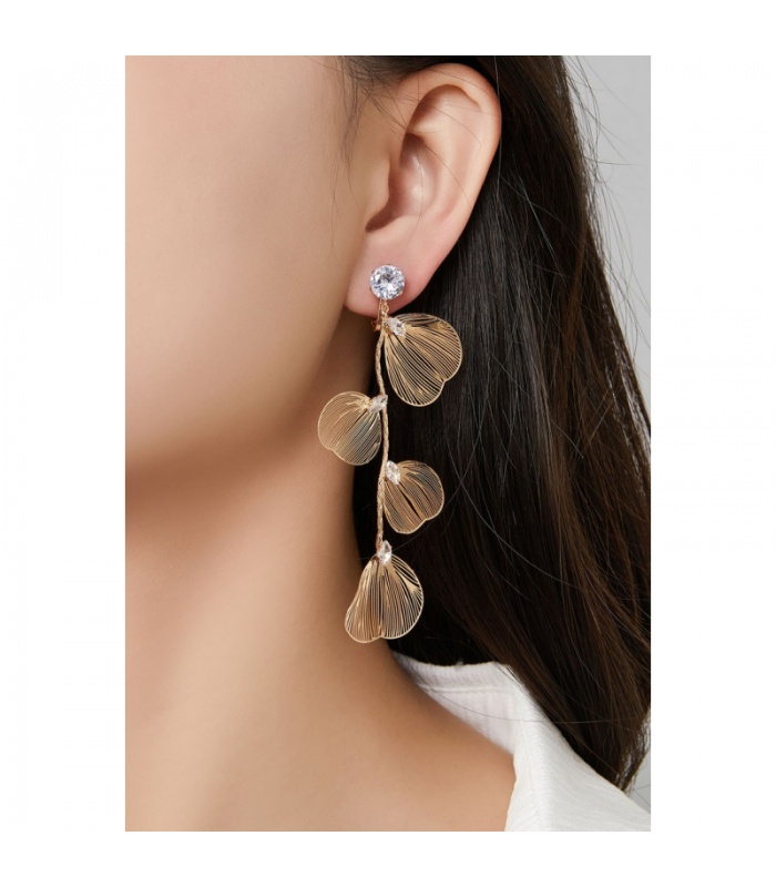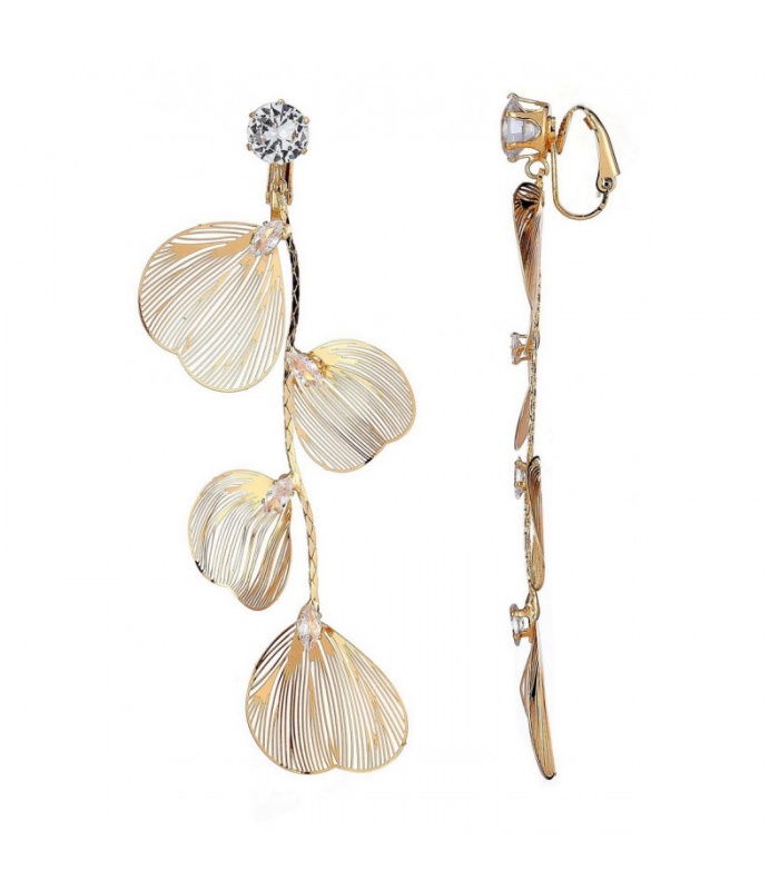 Deze goudkleurige oorclips met bladmotief en heldere kristallen steentjes voegen een vleugje natuur en elegantie toe aan je look. Het verfijnde ontwerp combineert de sierlijke vormen van bladeren met de sprankeling van kristallen, perfect voor zowel dagelijkse als speciale gelegenheden.
