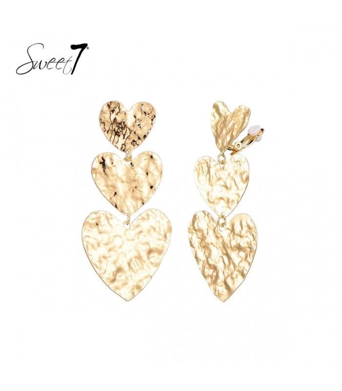 Zoek je een statement die liefde en glamour uitstraalt? Deze goudkleurige oorclips met drie getextureerde hartjes geven je outfit direct een modieuze boost. De speelse schakeling van de hartvormen vangt elk licht en zorgt voor een opvallend maar elegant effect. Perfect voor feestelijke looks of een stijlvolle avond out.