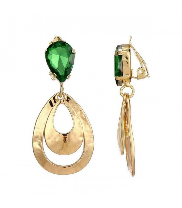 Wat geeft jouw look direct een luxueuze upgrade? Deze oorclips combineren een glanzende goudkleurige compositie met een groene, druppelvormige steen. Het gefacetteerde kristal vangt het licht, terwijl de open vormen zorgen voor een luchtige, moderne uitstraling.