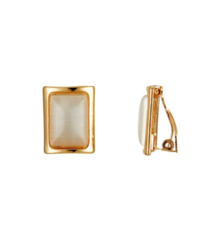 Rechthoekige oorclips met iriserende inleg in goudkleurige zetting.